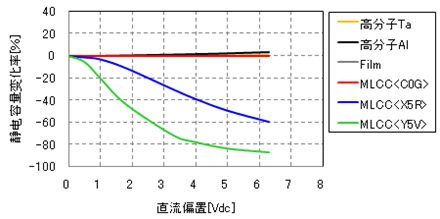 直流偏置特性是指,对电容器施加直流电压时实际静电容量发生变化(减少)的现象。这种现象是使用了钛酸钡系铁电体的高介电常数类片状多层陶瓷电容器特有的现象,导电性高分子的铝电解电容器(高分子AI)和导电性高分子钽电解电容器(高分子Ta)、薄膜电容器(Film)、氧化钛和使用了锆酸钙系顺电体的温度补偿用片状多层陶瓷电容器(MLCC)上几乎不会发生这种现象(参照图1)。