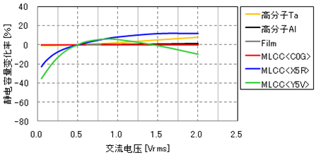 交流电压特性是指,对电容器施加交流电压时实际静电容量发生变化(增减)的现象。这一现象与直流偏置现象相同,是使用钛酸钡系铁电体的高介电常数类片状多层陶瓷电容器特有的现象,导电性高分子的铝电解电容器(高分子AI)和导电性高分子钽电解电容器(高分子Ta)、薄膜电容器(Film)、氧化钛和使用锆酸钙系的顺电体的温度补偿用片状多层陶瓷电容器(MLCC)上几乎不会发生这种现象(参照图3)。