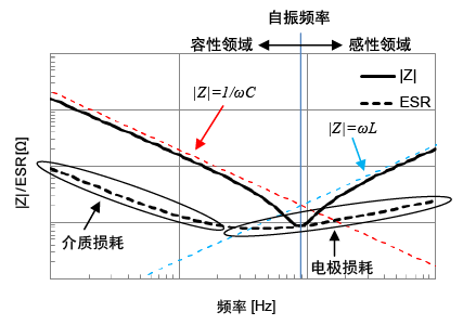 共振点附近:频率升高,则|Z|将受寄生电感或电极的比电阻等产生的ESR影响,偏离理想电容器(红色虚线),显示最小值。|Z|为最小值时的频率称为自振频率,此时|Z|=ESR。若大于自振频率,则元件特性由电容器转变为电感,|Z|转而增加。低于自振频率的范围称作容性领域,反之则称作感性领域。