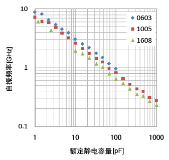 图6表示各尺寸多层陶瓷电容器的额定容量与自振频率的关系。相同容量,尺寸越小,自振频率越高,则ESL越小。由此,可以说长度l较短的小型电容器适用于高频领域。