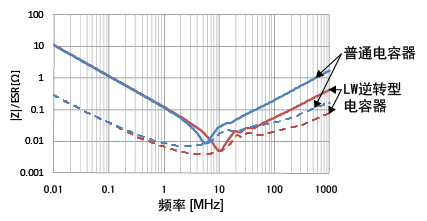 图8.LW逆转型电容器与通用品的|Z|/ESR
