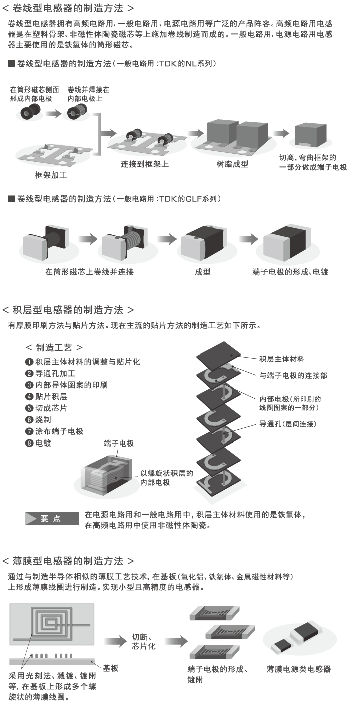 下面简述多用于电子设备的电感器中,最具代表性的卷线型、积层型、薄膜型电感器的制造方法。以TDK为例说明: