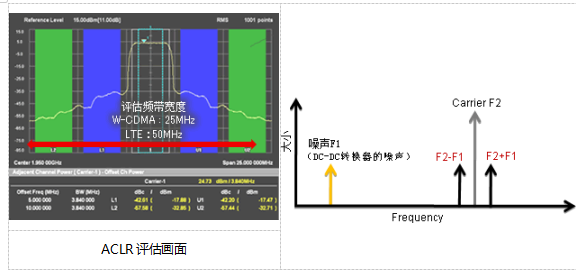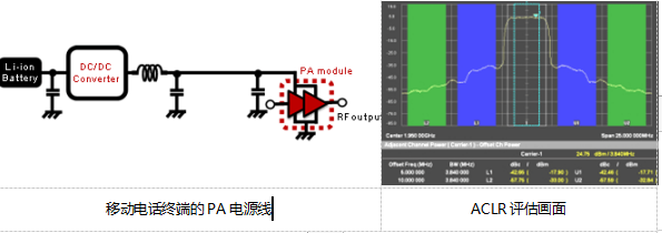 例如,在射频信号完整性评估中,一般的ACLR评估频率带宽,以载波频率 (F2) 为中心,W-CDMA为25MHz,LTE则为50MHz。如果只考虑单侧,根据载波频率 (F2) 评估,W-CDMA的带宽将为12.5MHz,LTE的带宽将为25MHz。因此,在ACLR测试中,对于W-CDMA来说,频率在12.5MHz以下的噪声 (F1) 对射频信号完整性有影响; 对LTE来说,频率在25MHz以下的噪声对射频信号完整性有影响。对低频带的噪声来说,DC-DC转换器的开关噪声 (一般来说,PA用DC-DC转换器的开关频率为2~10MHz) 为主要原因。DC-DC转换器的开关噪声对射频信号完整性有影响。要消除PA电源线的噪声,必须抑制DC-DC转换器开关噪声的电平。