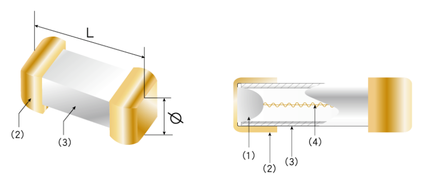 3.端电极:(Cu铜/Ni镍/Sn锡) 4.保护防焊层:防火级环氧树脂,符合UL-94-V0要求(绿色) 5:印文防焊层:防火级环氧树脂,符合UL-94-V0要求(黑色) 6:侧边电极:(Cu铜/Ni镍/Sn锡) NANO型: 1.焊接材料:Sn锡 2.铜帽:铜镀金 3.本体:陶瓷管 4.熔丝:合金线 插件型: Sub-miniature fuse: 1.外壳:塑料 2.镀锡铜线 3.内芯:塑料 4.填充剂:石英砂 5.熔线:合金线 轴状型: Micro fuse 1.外铜帽:铜镀 2.焊接材料:锡 3.内铜帽:铜镀镍 4.本体:陶瓷管 5.熔丝:合金线 6.外壳:塑料 7.引线:镀锡铜线 Ceramic tube fuse 1.焊接材料:锡 2.本体:玻璃管 3.铜帽:铜镀镍 4.熔丝:合金线 SDM贴片保险丝由于受到体积与结构的限制,I²T及BC能力比DIP fuse低,主要适用于DC低压转换或DC输出保护。(未来在AC电压下BC能力的提升,将逐步推广应用于AC-DC) DIP插件型的主要优势是认证齐全,但是随着小型化产品,逐步会转向SMD型。