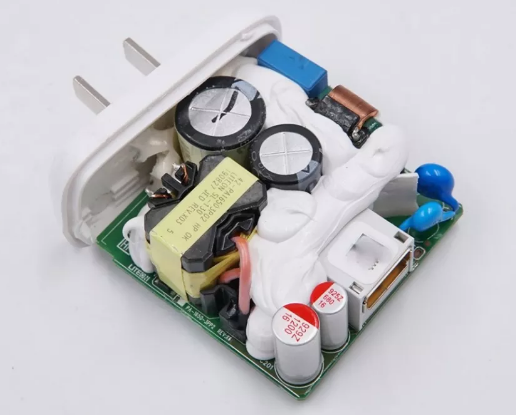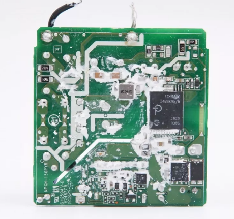 首先是由于体积的原因,此安排元器件布局很紧凑,加上有发热元件磁环电感共模电感及变压器等元件,都会产生较高热量,因此使用填充剂将其与电解电容进行分离。