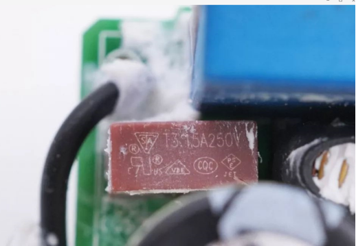 其次该产品使用了一颗3.15A 250V的延时华德品牌保险丝,该保险丝明显优于保险电阻,在很多充电器中,为了节省成本,工程师会选择保险电阻。