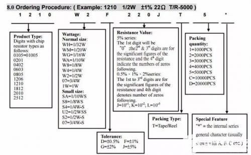 另外,贴片电阻器封装和承受的最大功率关系如下: 0201封装功率1/20W,0402封装功率1/16W,0603封装功率1/10W,0805封装功率1/8W,1206封装功率1/4W。 由于贴片电阻体积小、虚焊少,高频特性好,在生产线上贴片电阻的生产效率要远远高于直插式电阻。 作为一名电子元器件搬运工,每天都要和电子接触,如何更精确有效的选购电阻产品? 当你在一个实际应用中选择电阻时,通常需要明确知道阻值、精度,以及功率和材质等。下面我们来讲一下薄膜和厚膜电阻(贴片电阻)的型号命名方式。