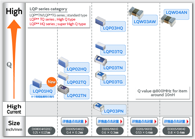 高频电感器被广泛用于具有无限通信功能的RF部分的匹配用途和电感线圈用途。 使用具有3大特点的制作工艺,通过不同用途选择合适的系列。小型具有高Q值的滤波型LQP系列非常适合智能手机和模块。此外,1005mm以上尺寸中,面向基站和STB的具有高Q值大额定电流值的绕线型LQW系列,性价比高,从长期的市场实际业绩来看,向您推荐面向汽车市场的多层型LQG系列。此外,也提供适合使用磁性材料的电源线用扼流电路的LQW_CN系列、LQW_H系列等产品。请通过使用用途、尺寸、显示Q特性关系的选择工具来选择合适的产品阵容系列。