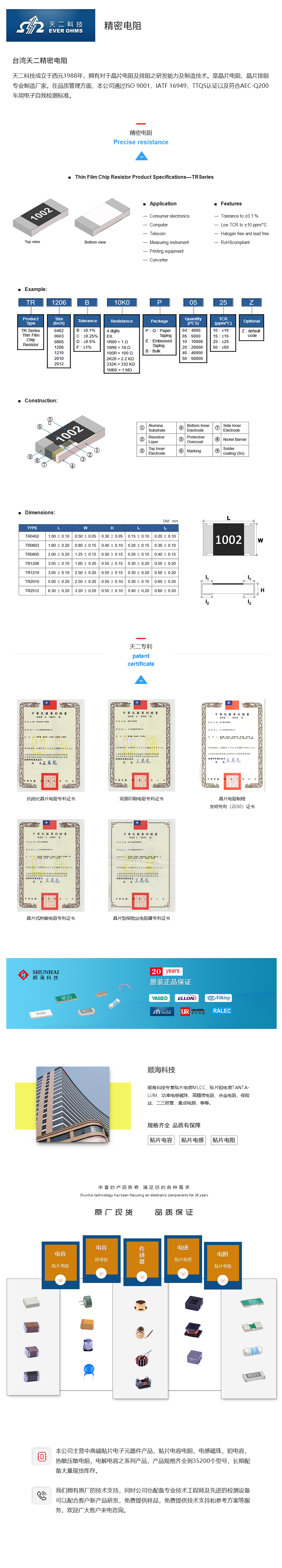 0805 604R 顺海代理天二精密电阻优势: